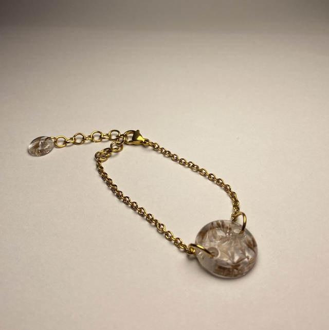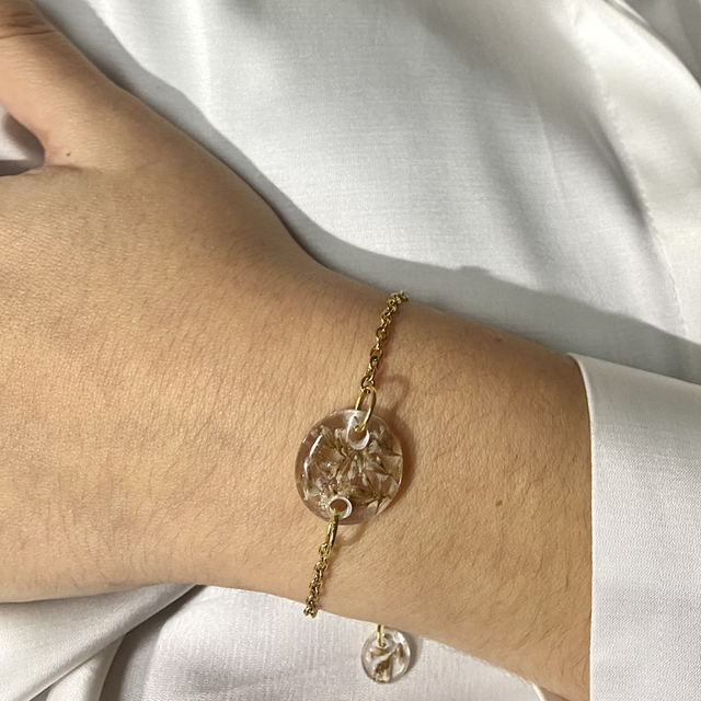 Un bracelet délicat et unique, fait main, qui ajoutera une touche naturelle à votre poignet. Le charm, fabriqué avec de véritables fleurs séchées, fait de chaque bracelet une pièce originale.