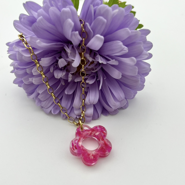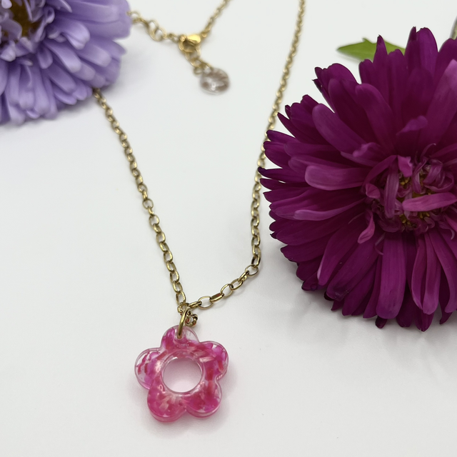 Chaque charm est fabriqué avec de véritables fleurs séchées que je récolte et prépare moi-même. Chaque fleur est unique, donc chaque collier l’est aussi !