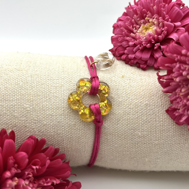 Chaque bracelet est réalisé avec de véritables fleurs séchées que je récolte et prépare moi-même. Chaque fleur est différente, donc chaque bracelet est unique !