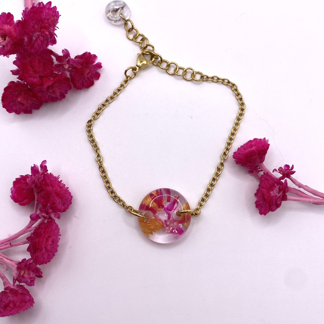 Chaque charm est fabriqué avec de véritables fleurs séchées récoltées et séchées par mes soins. Chaque fleur est différente, donc chaque bracelet est unique !