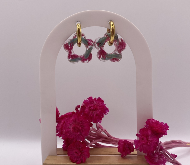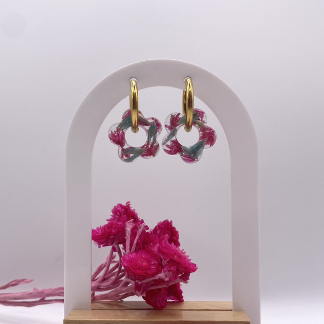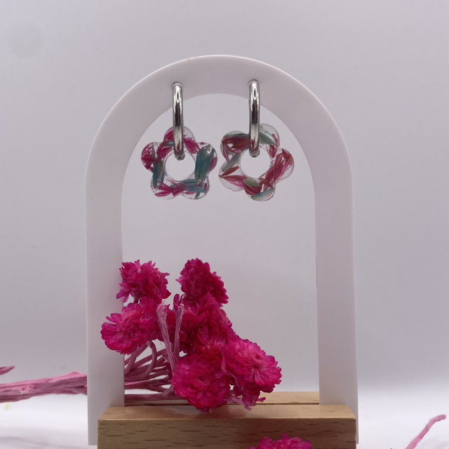 Chaque charm est fabriqué à la main avec de véritables fleurs séchées par mes soins. Comme chaque fleur est unique, vos boucles le seront aussi !